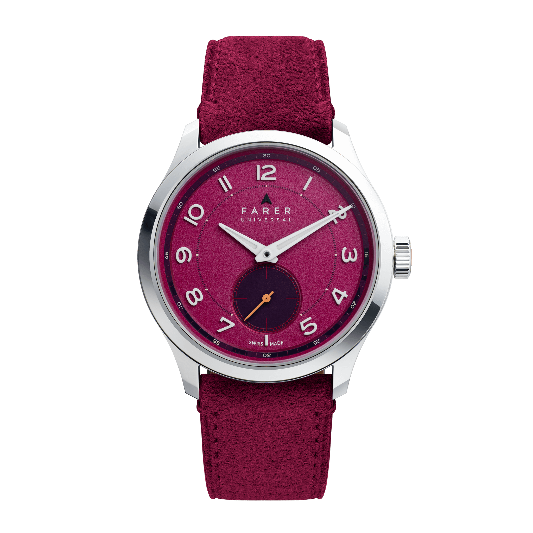 Slimline 38mm watch with textured raspberry dial and contrast purple sub dial.