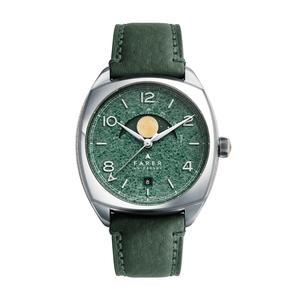 Green aventurine gloss dial with applied numerals and markers made from Grade OL X1 Super-LumiNova. Hand-painted green moonphase disc with a yellow moon in Grade OL X1 Super-LumiNova