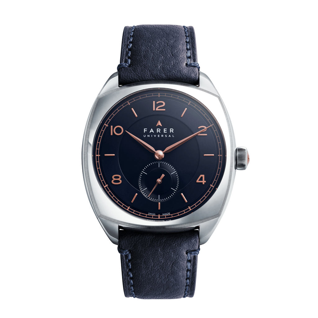 The brushed metallic dial of the Mansfield Midnight is a deep inky blue, punctuated by polished batons and numerals in rose gold. These are mounted onto a raised sector dial and are matched with a rose gold railroad minute track running along the outer edge of the dial. The slim dauphine handset is also polished and finished in a rose gold PVD coating. Above the six o’clock position is a sunken seconds sub-dial featuring an engine-turned texture. The combination of this sunken sub-dial and the raised sector with its applied markers gives the dial a sense of depth, whilst the metallic tones of the dial, combined with the polished rose gold hands and markers give the watch a clean, sophisticated aesthetic that makes the Mansfield Midnight a striking watch on the wrist.