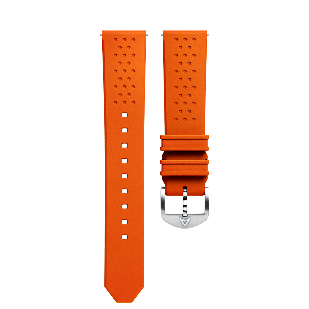 Textured, perforated natural rubber strap with 316L stainless steel buckle. Featuring quick-release spring bars, allowing you to change the straps of your watch in seconds without the use of a tool.